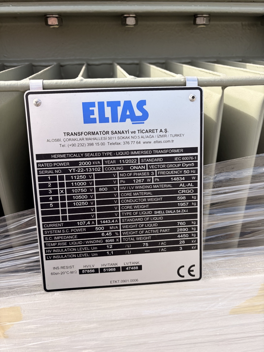 Vermogen 2000 kVA bij 800 Volt 50Hz.