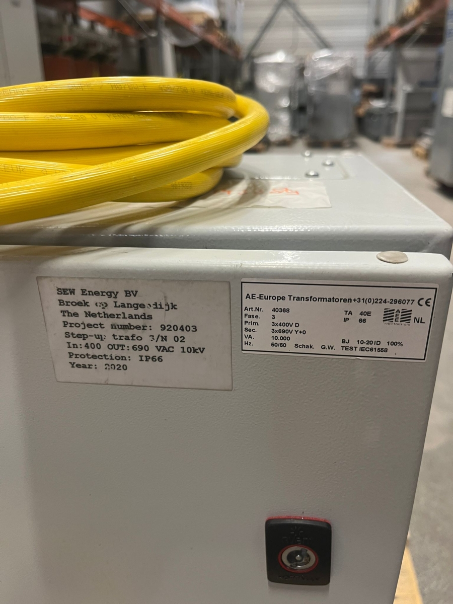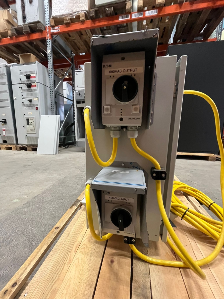 Ingebouwd in stevige IP66 stalen omkasting met externe hoofdschakelaars voor zowel de 400v als de 690v kant. Inclusief kabels aan beide kanten.
