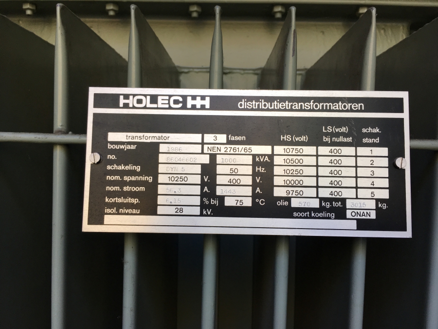 Vermogen 1000 KVA bij 400 Volt 50Hz.