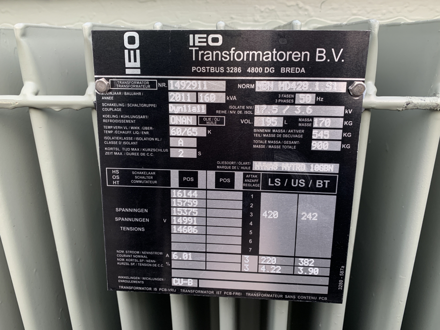 Vermogen 160 kVA bij 420 Volt 50Hz.