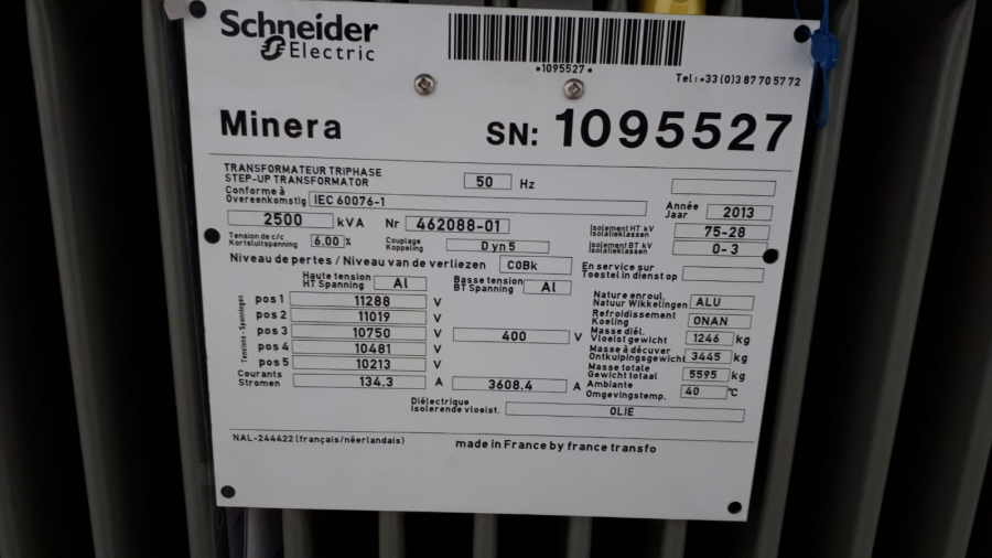 Vermogen 2500 kVA bij 400 Volt 50Hz.