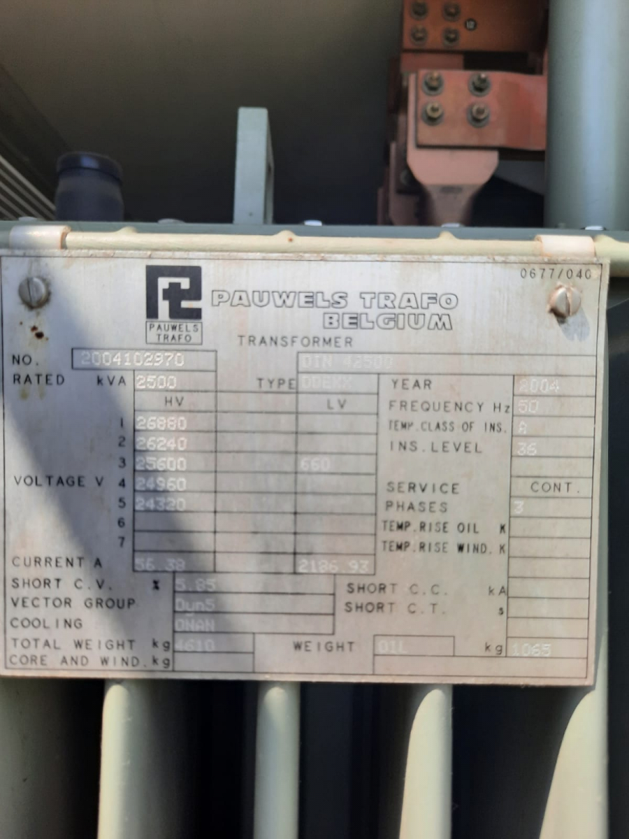Vermogen 2500 kVA bij 660 Volt 50Hz.