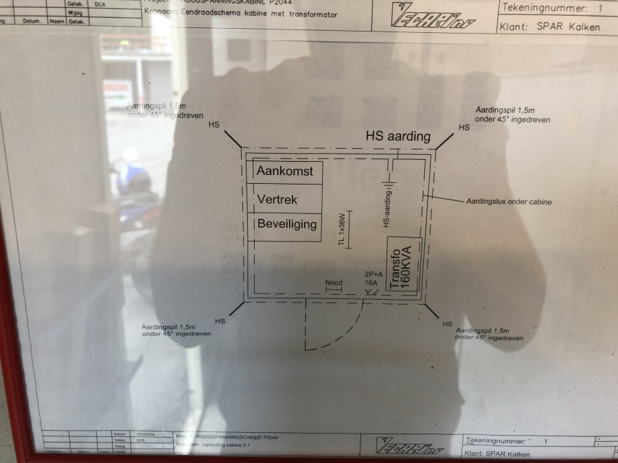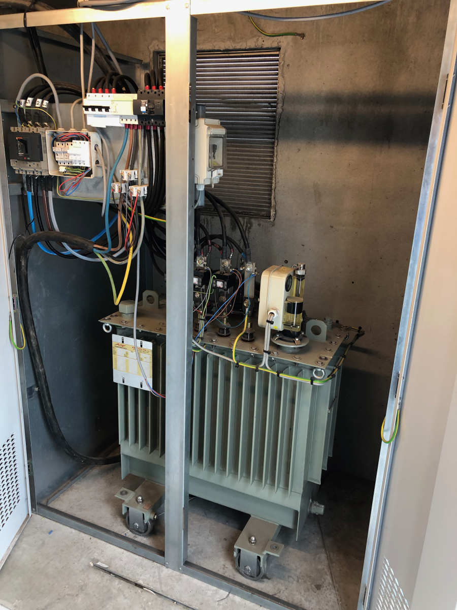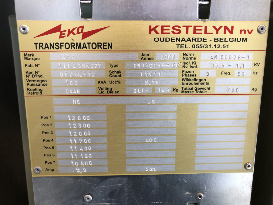 - een olie gevulde transformator met een capaciteit van 160 kVA. Merk Kestelyn. Uitgangspanning 400 volt.