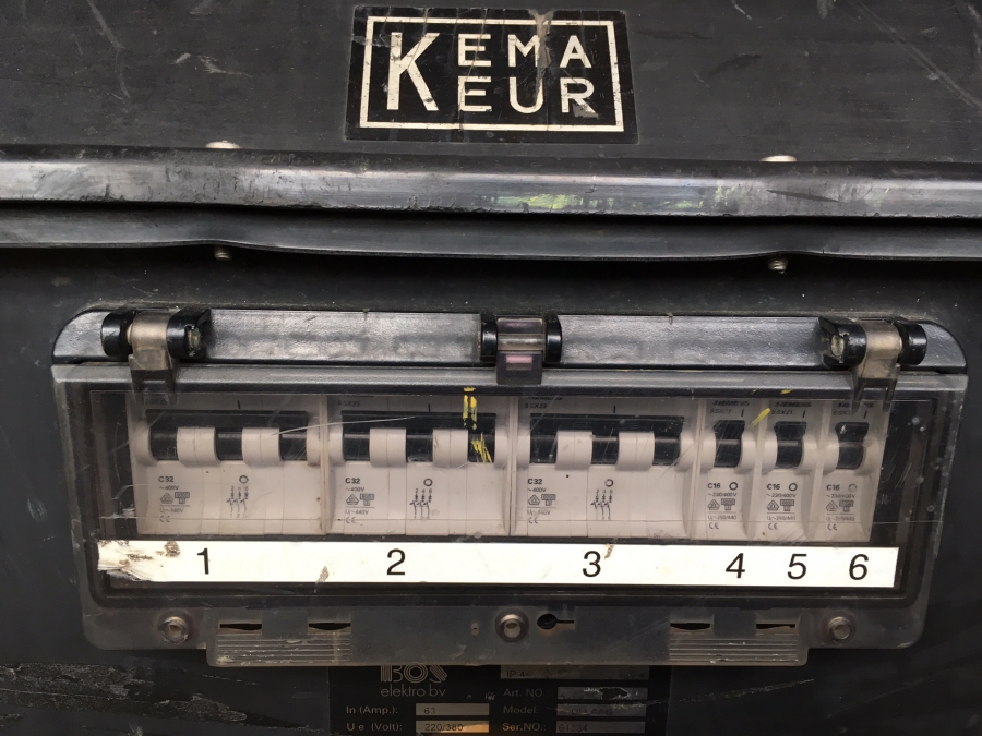 - 3x 32 Ampere 400 Volt 5-polige stekker, beveiligd met automaatzekering en aardlekschakelaar.